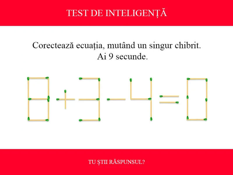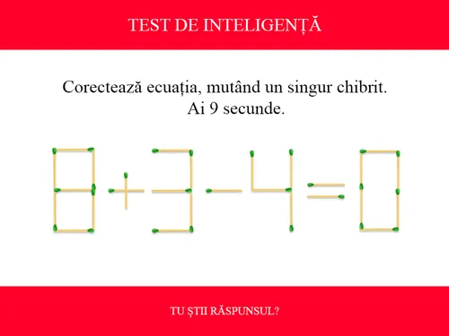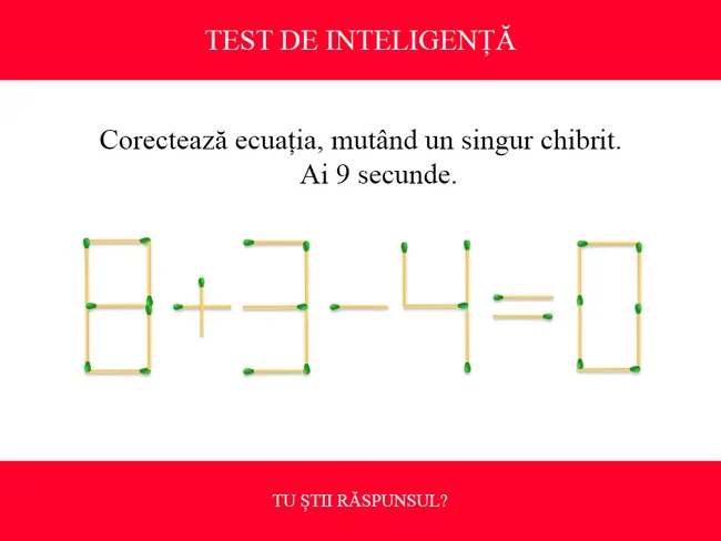 TEST DE INTELIGENȚĂ Corectează ecuația 8+3-4=0, mutând un singur chibrit. Poți rezolva în 9 secunde?