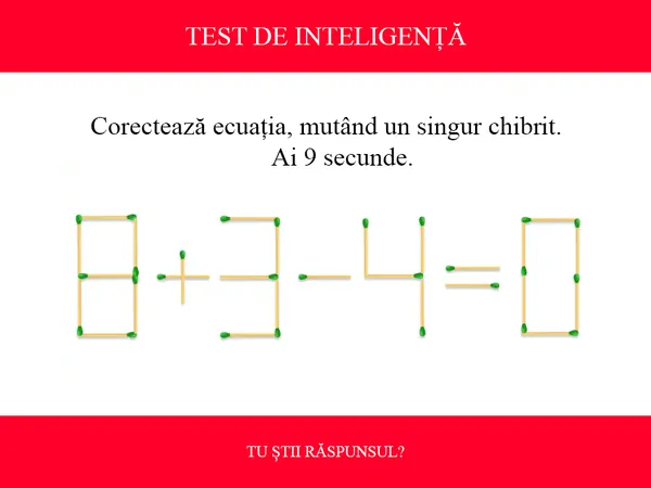 Se dă ecuația greșită 8+3-4=0. Cifrele sunt formate din bețe de chibrit. Provocarea este să muți doar un băț de chibrit pentru a corecta ecuația. Crezi că te descurci?
