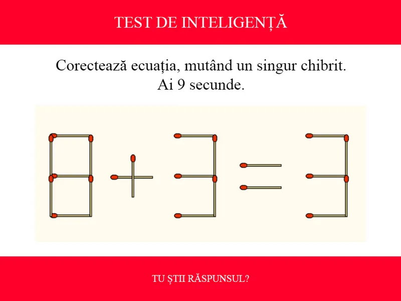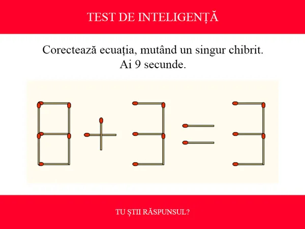 TEST DE INTELIGENȚĂ Corectează ecuația 8+3=3, mutând un singur chibrit. Ai doar 9 secunde să rezolvi