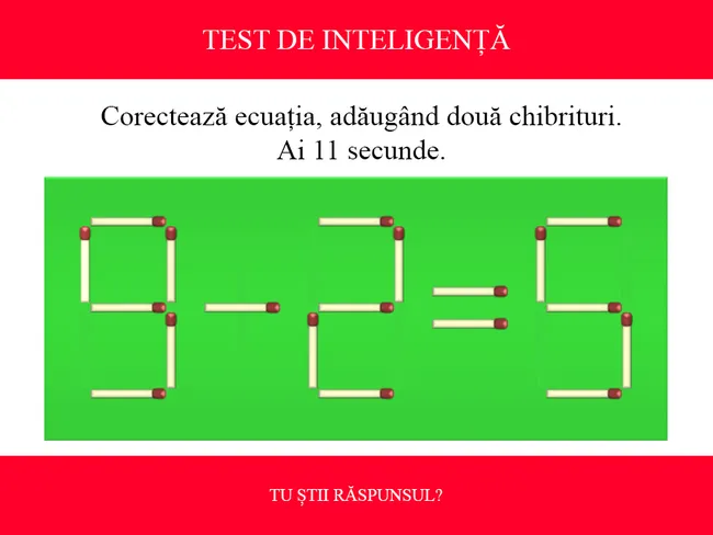 TEST DE INTELIGENȚĂ Corectează ecuația 9-2=5, adăugând doar două bețe de chibrit. Ai 11 secunde
