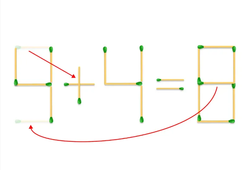 Pentru a rezolva, trebuie să elimini două chibrituri de la cifra 9, astfel încât să o transformi în cifra 4. Un chibrit trebuie mutat la semnul „-”, pentru a-l transforma în „+”, iar al doilea chibrit trebuie mutat la cifra 0, pentru a o transforma în 8. Astfel, obții ecuația corectă: 4+4=8.