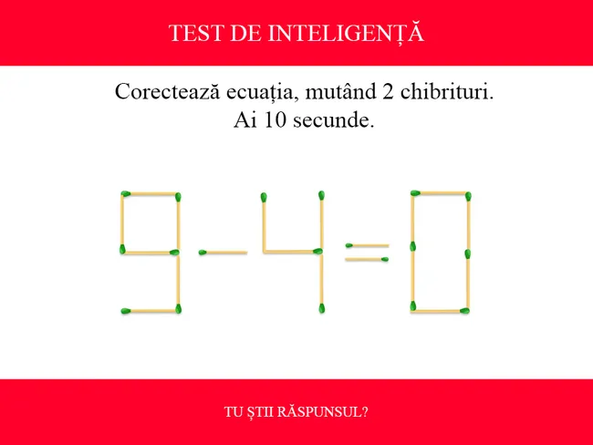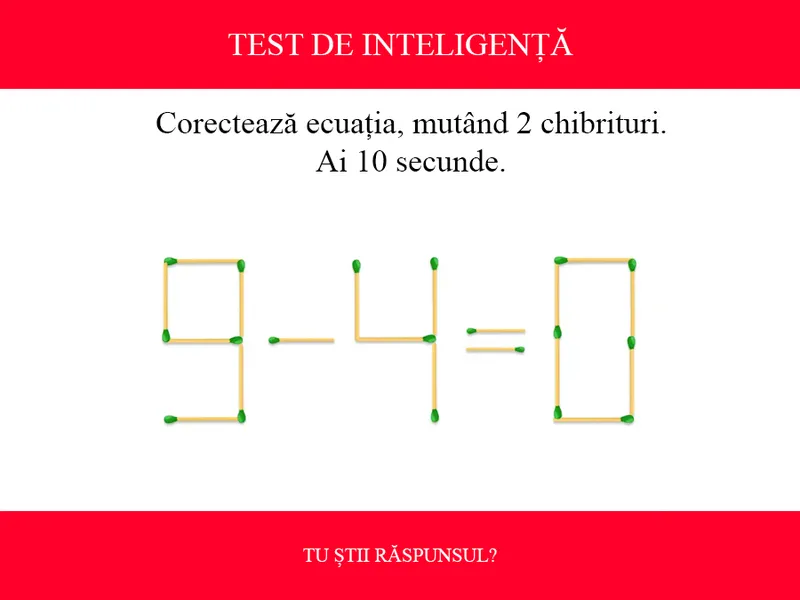 Se dă ecuația greșită 9-4=0. Cifrele sunt formate din bețe de chibrit. Provocarea este să muți doar două bețe de chibrit pentru a corecta ecuația. Ai doar 10 secunde la dispoziție.