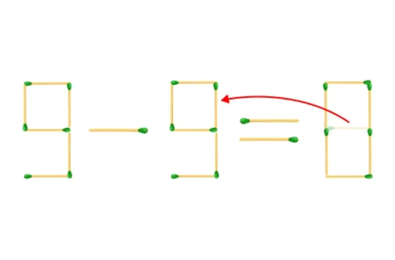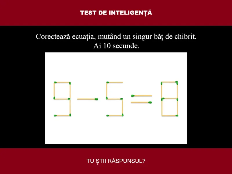 Se dă ecuația greșită 9-5=8. Cifrele sunt formate din bețe de chibrit. Provocarea este să muți un singur băț de chibrit pentru a corecta ecuația. Ai doar 10 secunde la dispoziție.