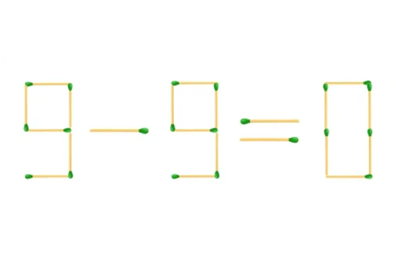 Pentru a rezolva, tot ce trebuie să faci este să elimini un chibrit de la cifra 8, astfel încât să o transformi în 0. Chibritul trebuie mutat la cifra 5, pentru a o transforma în cifra 9. Astfel, obții ecuația corectă: 9-9=0.