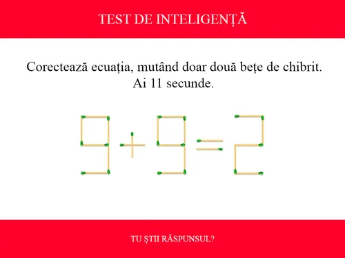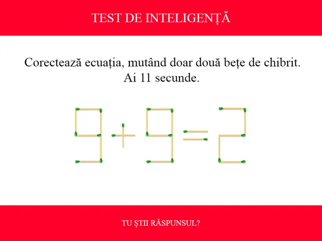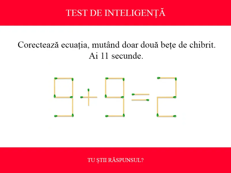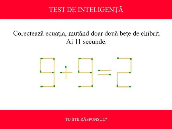 TEST DE INTELIGENȚĂ Corectează ecuația 9+9=2, mutând doar două chibrituri. Ai 11 secunde