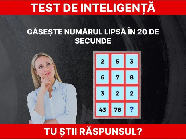 Citește și: Test de inteligență: ”Ce număr lipsește din din figură”. Ai 3 minute să dai răspunsul. L-ai găsit?