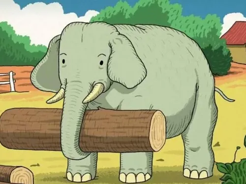 În imagine, poți vedea un elefant ținând un trunchi de buștean în trompă, iar în spatele elefantului, se află un hambar într-o fermă.