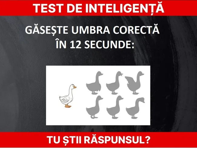 Testul de inteligență de azi este despre umbre. Aveți la dispoziție 12 secunde pentru a găsi umbra corectă a gâștei. Numai geniul poate face acest lucru.