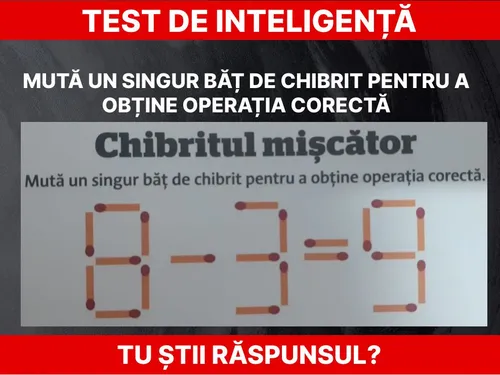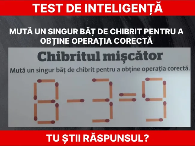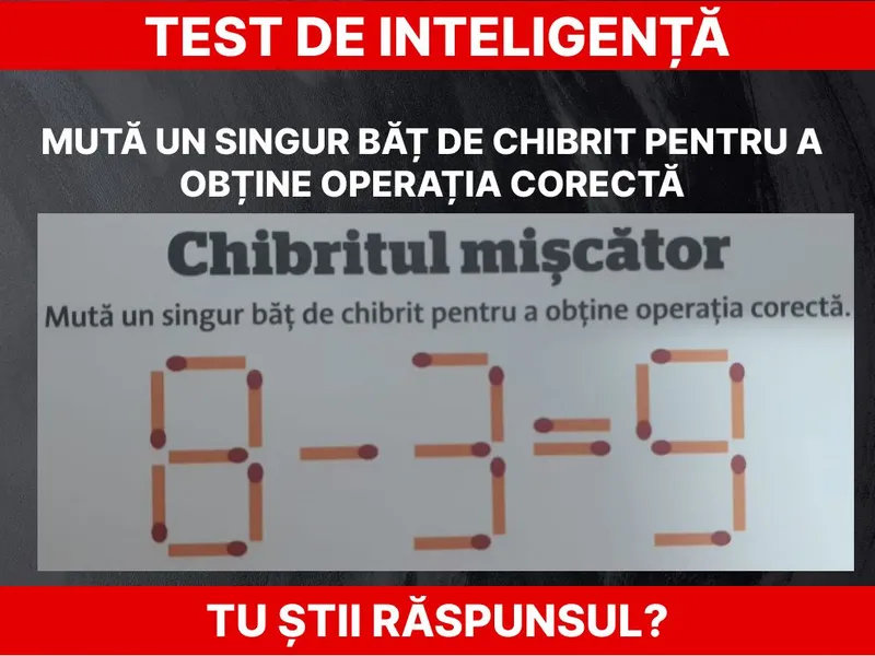 Vă propunem un test de inteligență foarte simplu. Se poate rezolva în 3 secunde. Avem operația greșită 8-3=9. Trebuie mutat un singur băț de chibrit pentru a obține operația corectă. Sigur ați văzut din prima mutarea!