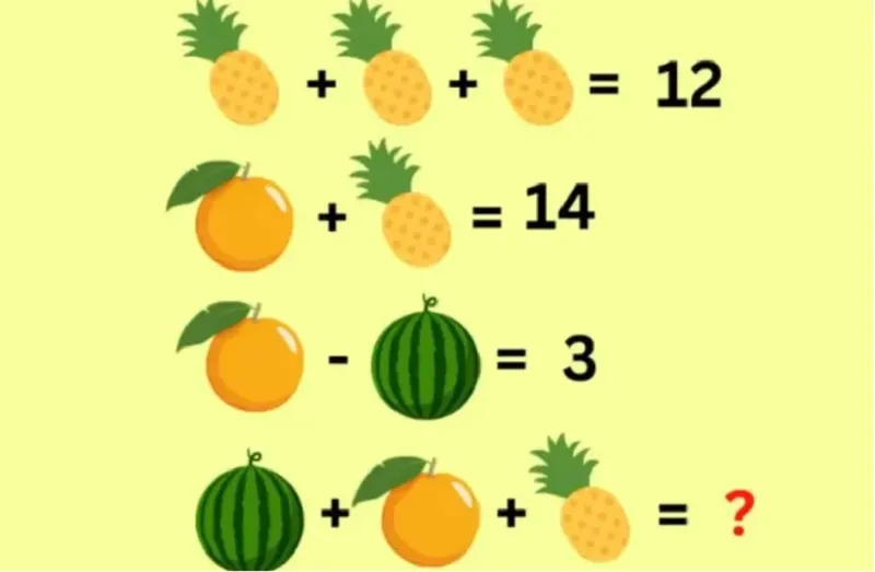 Acum ajungem laa patra ecuație: care este valoarea combinată a unui pepene verde, portocală și ananas? Încercați pe cont propriu.