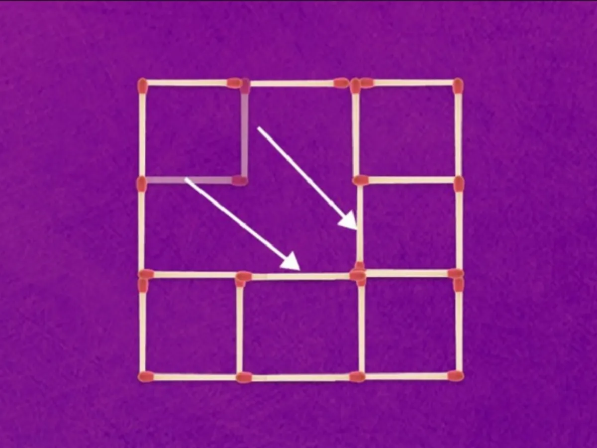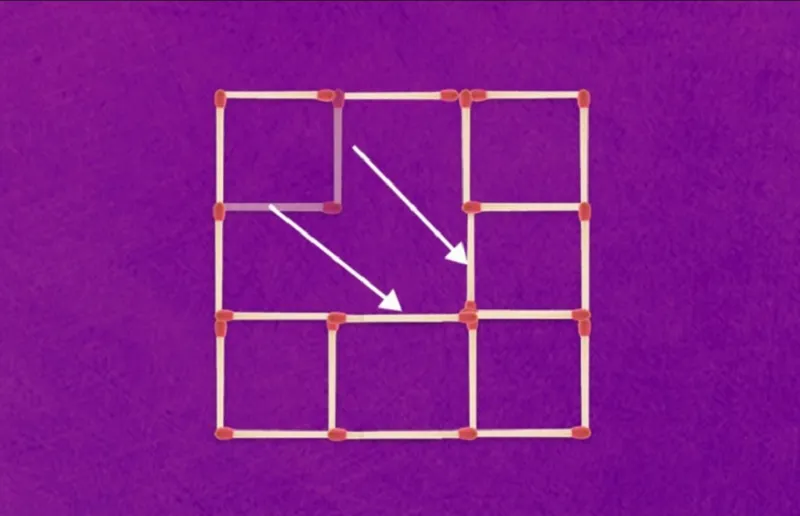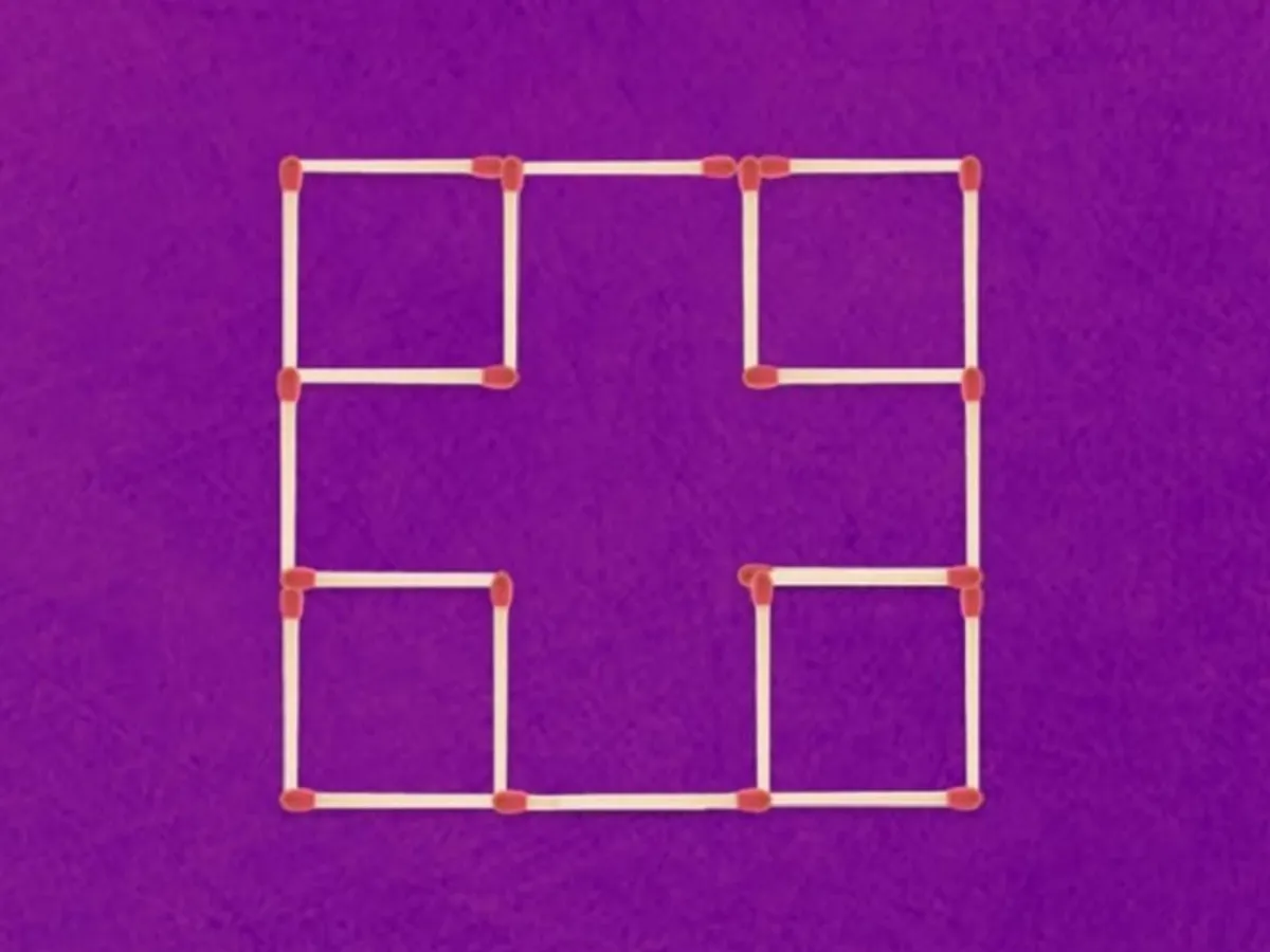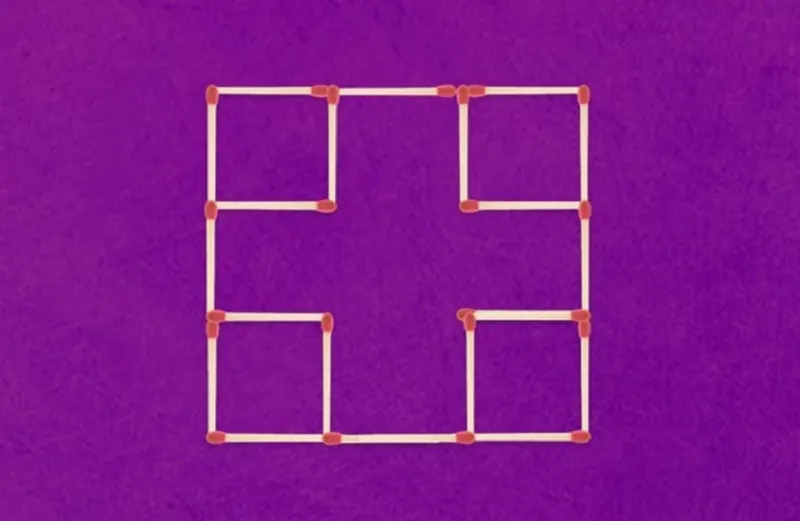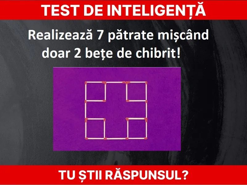 Imaginea afișează 20 de bețe de chibrit care creează cinci pătrate. Tot ce trebuie să faci acum este să muți două dintre ele pentru a crea șapte pătrate. Poți să o faci?