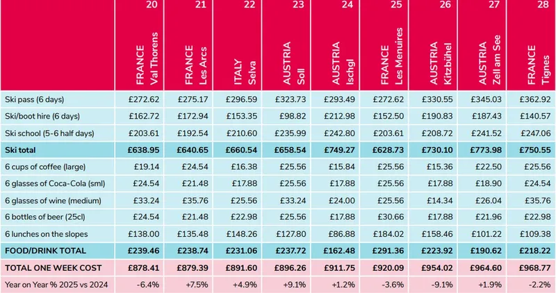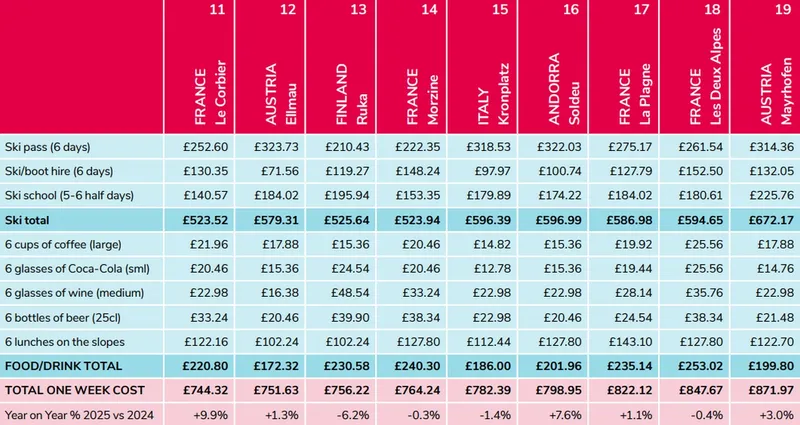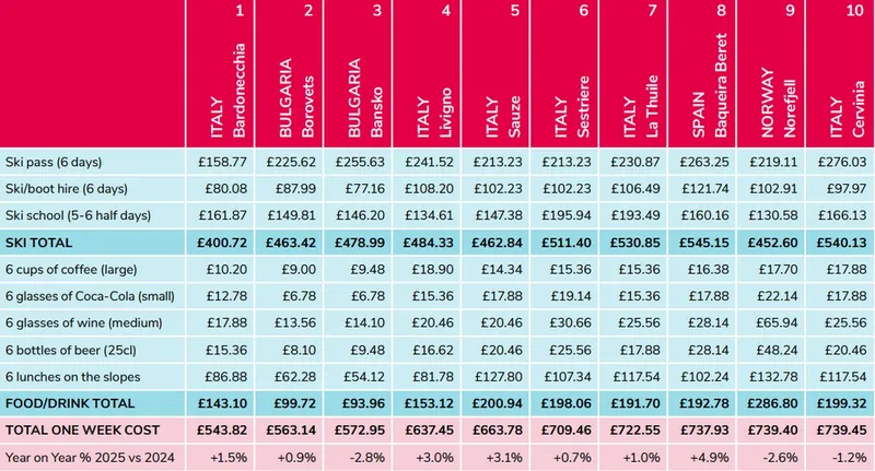 În fiecare an, firma britanică Post Office Travel Money realizează un clasament al stațiunilor de schi din Europa, luând în calcul costurile pe pârtii pentru o vacanță de 6 zile: