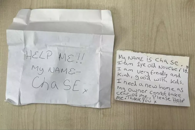 „Numele meu: Chase. Fac un 1 an pe 16 noiembrie. Sunt foarte prietenos și blând, bun cu copiii”, scria în bilet. „Am nevoie de o casă nouă deoarece stăpânul meu nu poate avea grijă de mine. Vă rog să mă ajutați. Vă mulțumesc.”