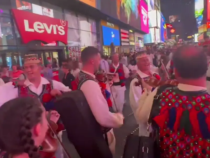 Zeci de români, îmbrăcați în straie populare au încins o horă în Time Square, emblematicul cnetru al orașului New York. Americanii, surprinsși, i-au admirat pe români.