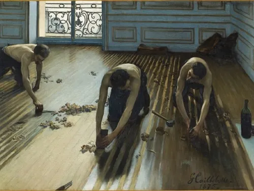 Gustave Caillebotte (1848-1894), căruia Muzeul d'Orsay îi dedică o expoziţie inedită, a pictat bărbaţi care rindeluiesc un parchet, ies din baie sau se plimbă prin ploaie, ca şi cum s-ar fi lăsat surprinşi de un prieten fotograf.