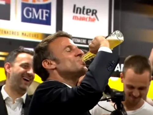 VIDEO Macron, președintele Franței, băutor de bere „profesionist”. A golit sticla în 17 secunde
