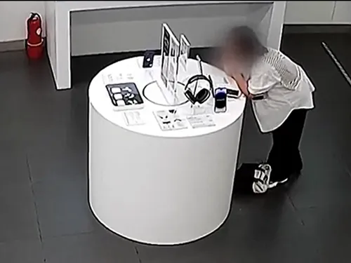 O femeie a fost filmată într-un magazin de telefoane în timp ce mușca dintr-un cablu antifurt în încercarea de a fura un iPhone 14 Plus care era expus pentru a fi testat de cumpărători.