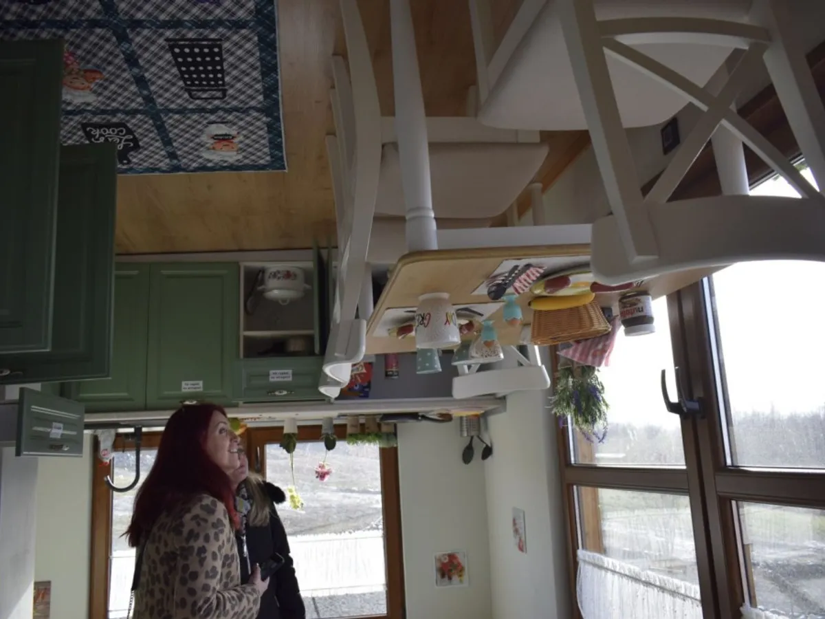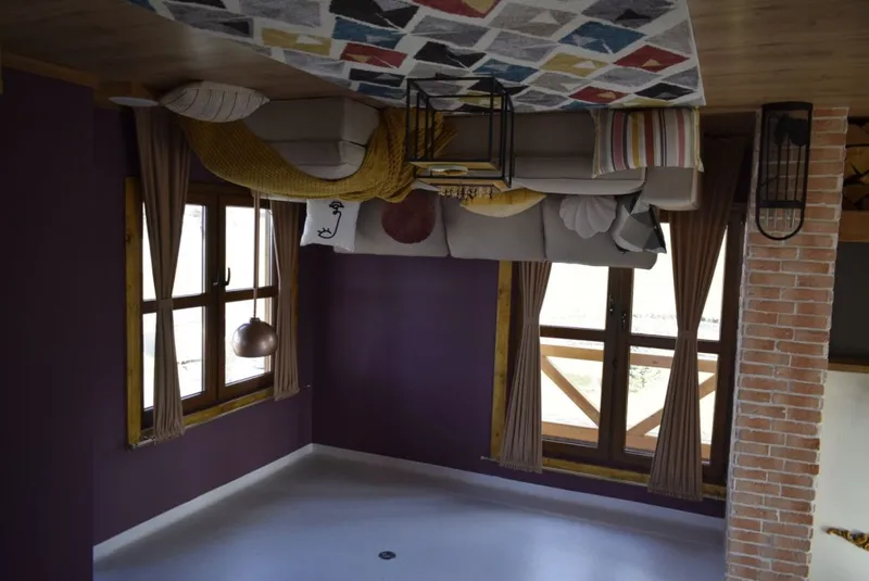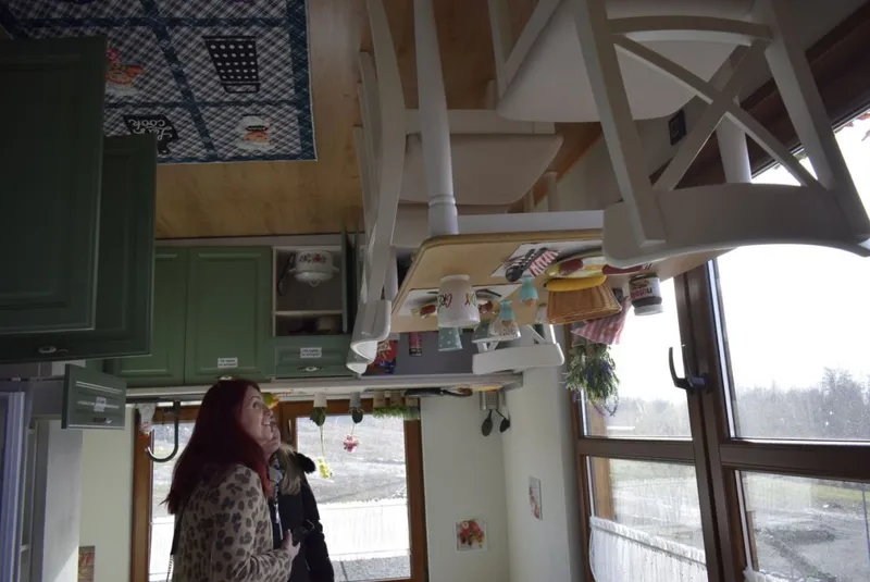 Casa întoarsă are ferestre cu jardiniere puse invers. Practic, perdelele şi florile de la geam sunt cu susul în jos. În loc de parter, vei vedea acoperişul, cu hornul fixat în pământ. În loc de acoperiş, în partea de sus a construcţiei se observă pragul casei, cu terasa şi corpurile de iluminat fixate invers.