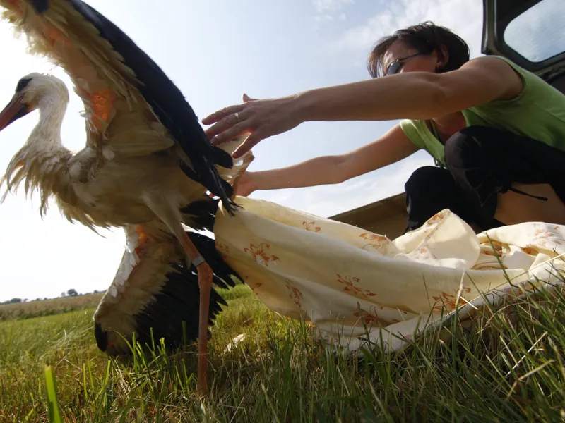 Un pui de barză a fost salvat, la limită, după ce a căzut pe firele de curent, în localitatea Cristian din județul Sibiu. Acolo, se află una dintre cele mai mari comunități de berze din România, cu 38 de cuiburi și 94 de pui eclozați anul acesta.