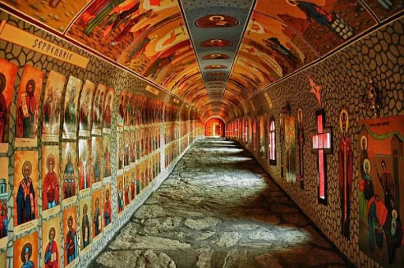 Calendarul reprezintă doar o treime din tunel. Pe tavan sunt pictate scene din Vechiul şi Noul Testament, iar pe o parte a tunelului sunt reprezentate 12 prăznicare ortodoxe, alături de cele zece porunci creştine. Nimic nu este la întâmplare. La ambele capete ale tunelului sunt porţi masive din lemn, iar lumina naturală este asigurată prin ferestrele decupate sub forma unor cruci. Iarna, când zăpada este mare, abia dacă se mai poate zări afară, pentru că ninsoarea acoperă aproape în totalitate tunelul. Vara, în schimb, peisajul care se deschide privirii combină verdele tare al muntelui cu panorama Văii Jiului.