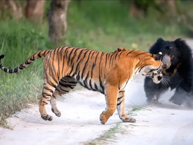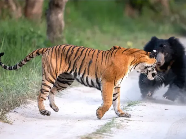 Vizitatorii unei rezervații naturale din India au fost recent martori la întâlnirea dintre un urs și o tigroaică.
