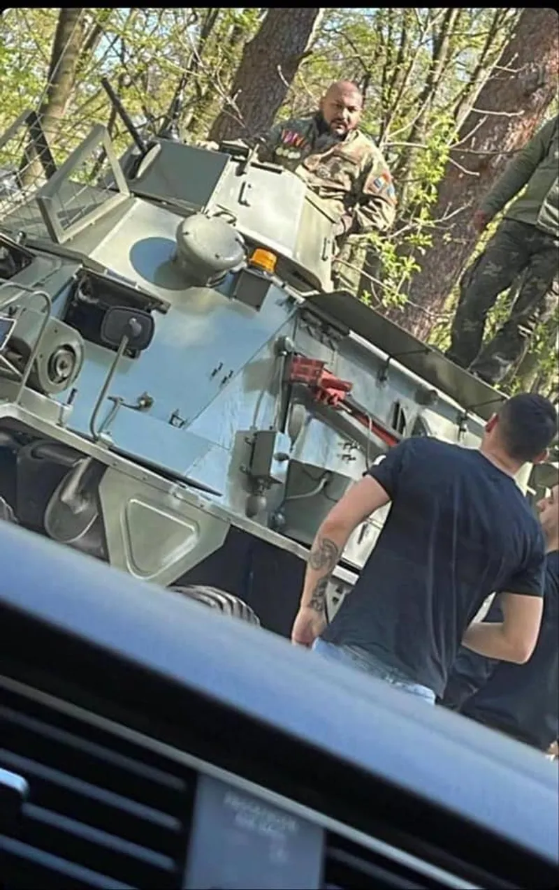 Manelistul Dani Mocanu a fost fotografiat „călare” pe blindată de către un martor ocular, potrivit Săptămâna în Oltenia.