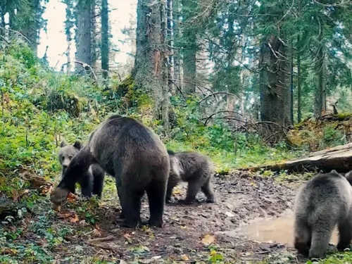 O ursoaică şi cei trei pui ai ei au fost surprinşi în imagini în Parcul Natural Apuseni, în timp ce beau apă dintr-o baltă şi umblă după hrană. Specialiştii transmit că, toamna, urşii adună rezerve de grăsime, pregătindu-se pentru somnul de iarnă.