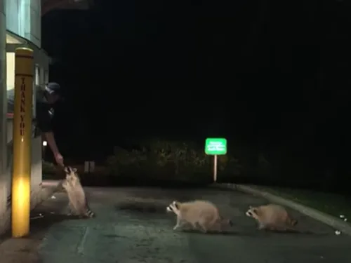 Așa cum am văzut câini trecând pe „zebră”, o familie de ratoni și-au făcut obiceiul de a veni la fereastra unui restaurant drive-in pentru a fi hrăniți de angajați.
