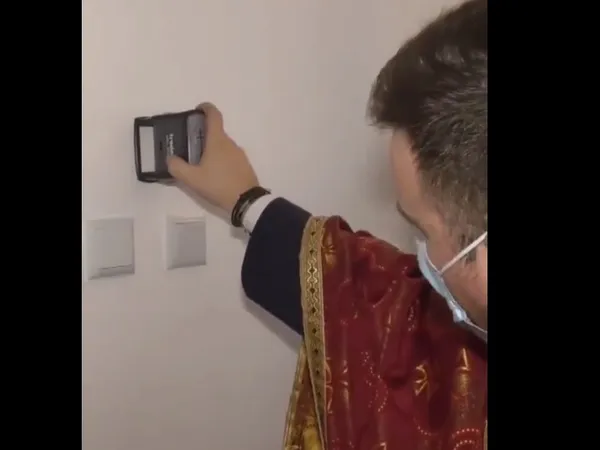 Un preot care sfințește casa cu o ștampilă cu cruce a devenit viral pe rețelele de socializare.